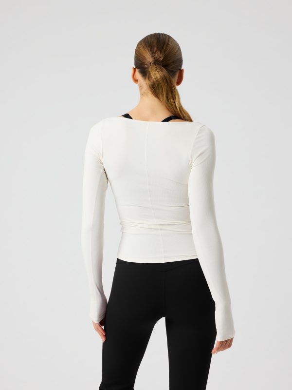 - Rounded square neckline and ballerina sleeves enhance freedom of movement during training