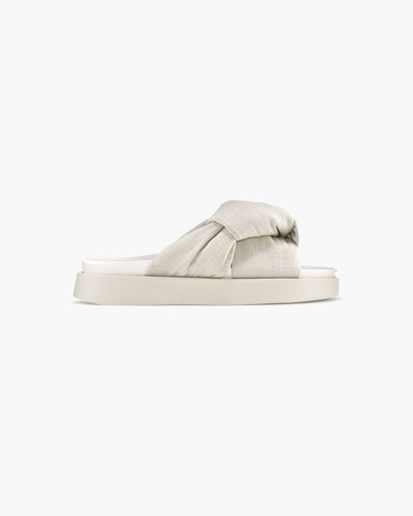 The “Oversized Linen Knot” sandal features a twisted knot on the front, creating a stylish silhouette. It is handcrafted from linen and leather and comes with a 2.5cm high sole.
