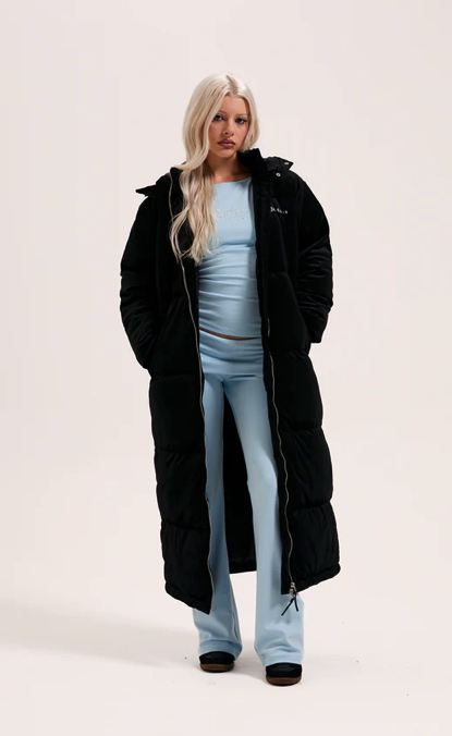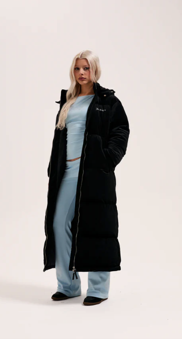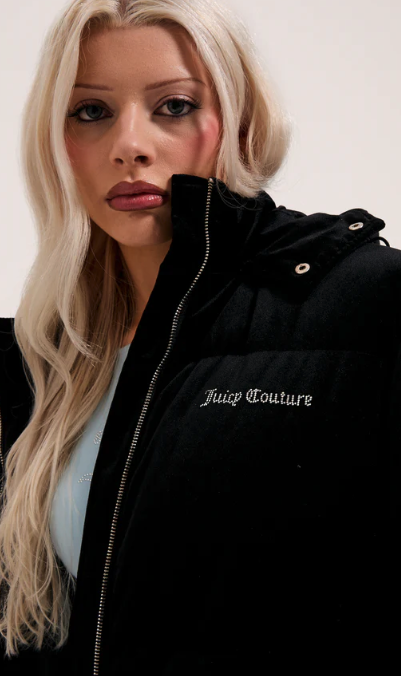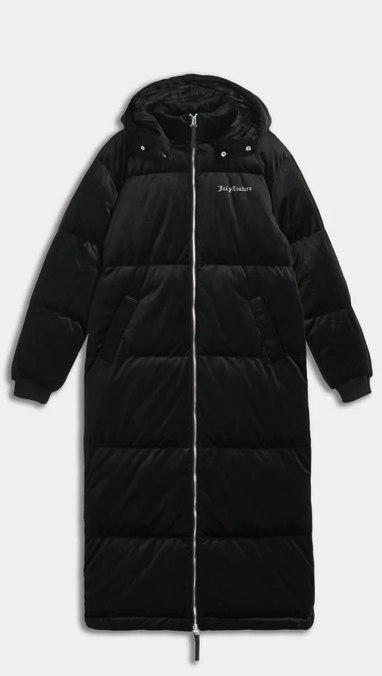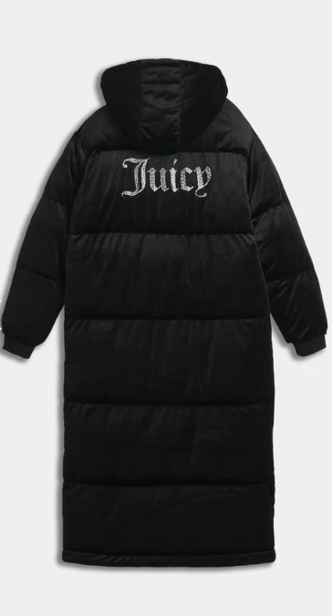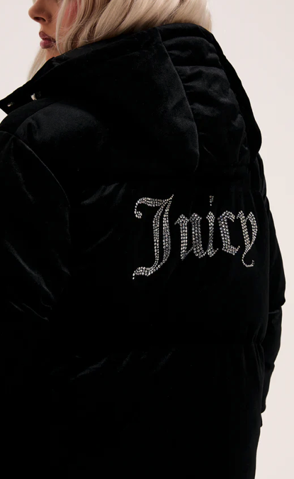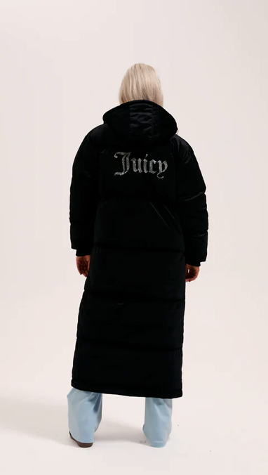 Longline puffa coat in black woven velour. This thick coat features full length zip fastening, popper funnel neck and adjustable toggles for a secure hood fit. With two front pockets, this coat is branded with a Juicy Couture diamante logo to the front and bold Juicy diamante logo at the back.