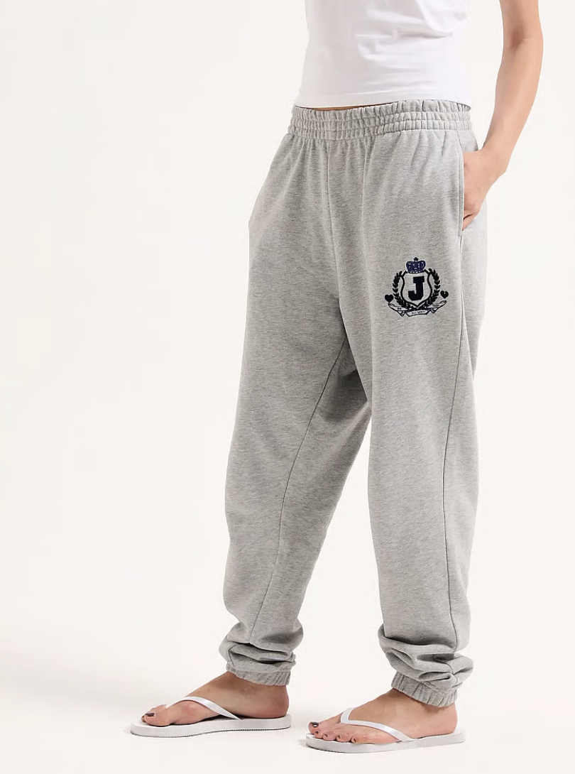 Mid rise cuffed joggers in pink marl fleece. These relaxed tracksuit bottoms feature a flocked & embroidered heritage crest to left hip and two side pockets. These track pants feature a ribbed waistband and  are finished with a embroidered crown and flocked J logo to back.