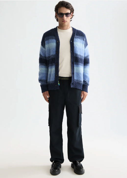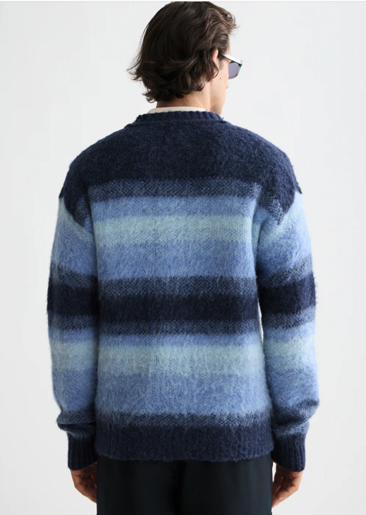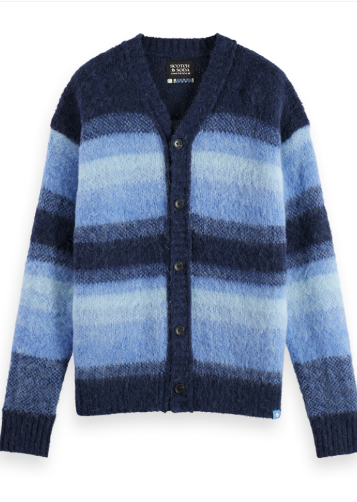 A soft striped alpaca-blend cardigan with a cozy texture and refined silhouette.