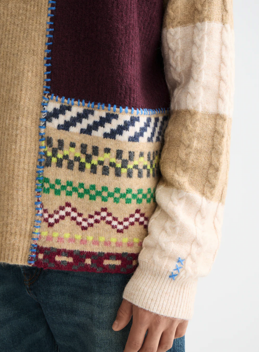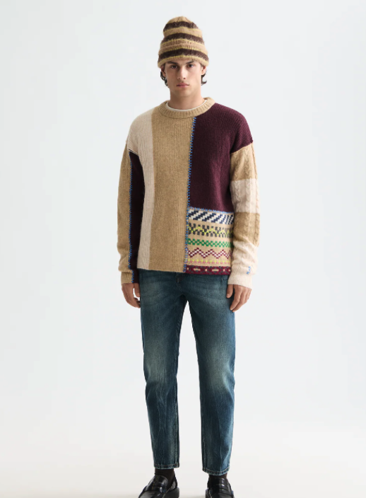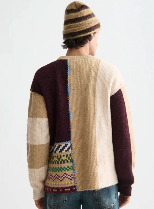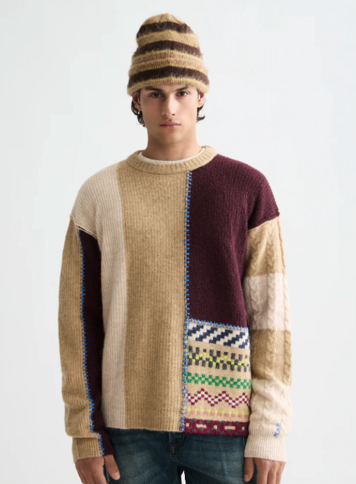 A loose-fit pullover with a bold patchwork design, blending texture and pattern for a layered look.