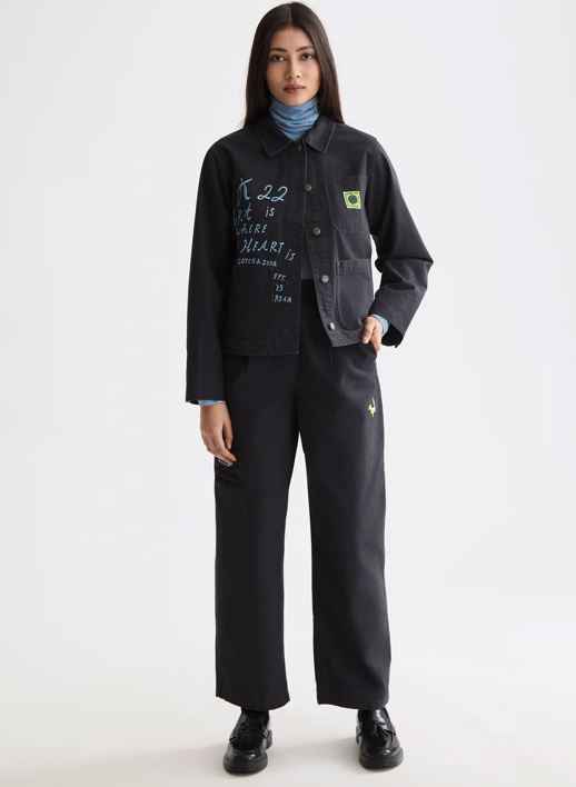 An instant statement piece, this washed-denim workwear jacket features hand-drawn text and an old-school logo.