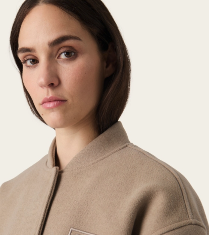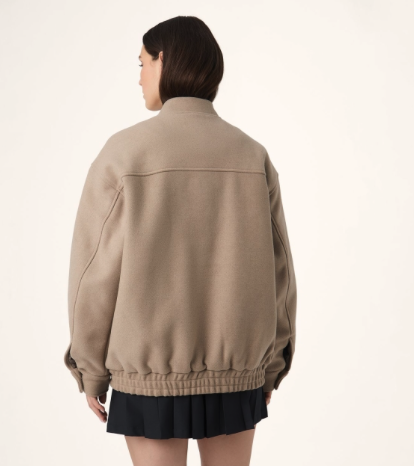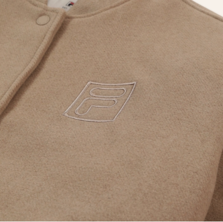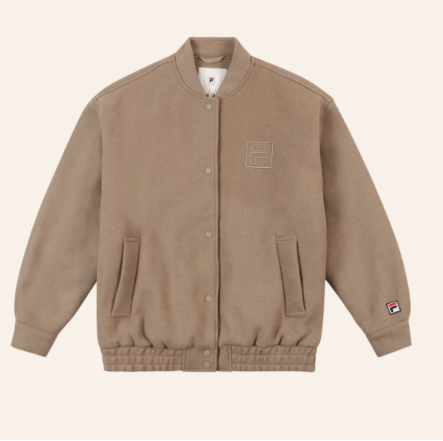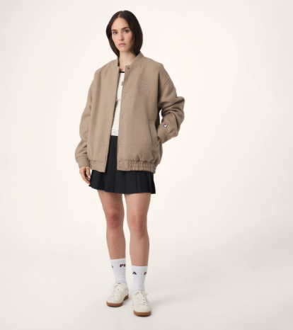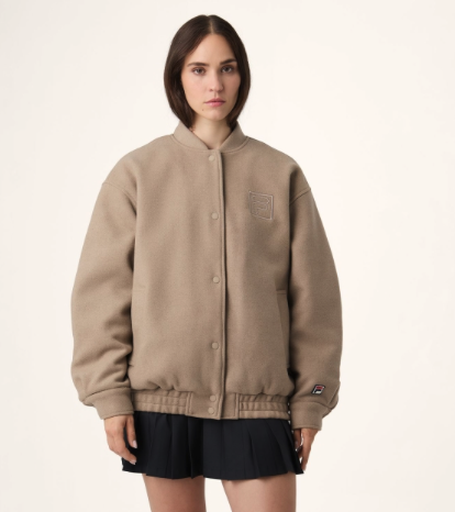 Fila womens oversized felted varsity jacket. 65% Polyester, 15% Wool, 10% Viscose, 5% Polyacryl, 5% Polyamide