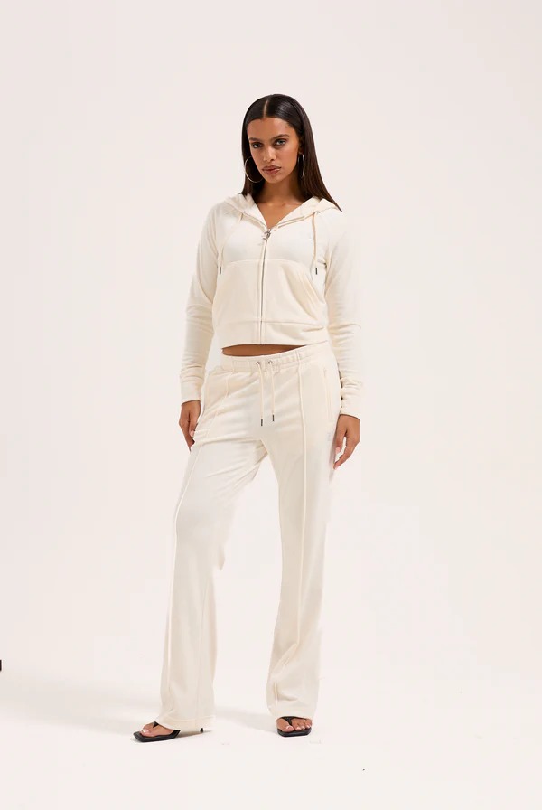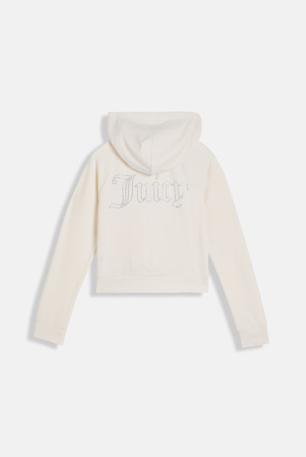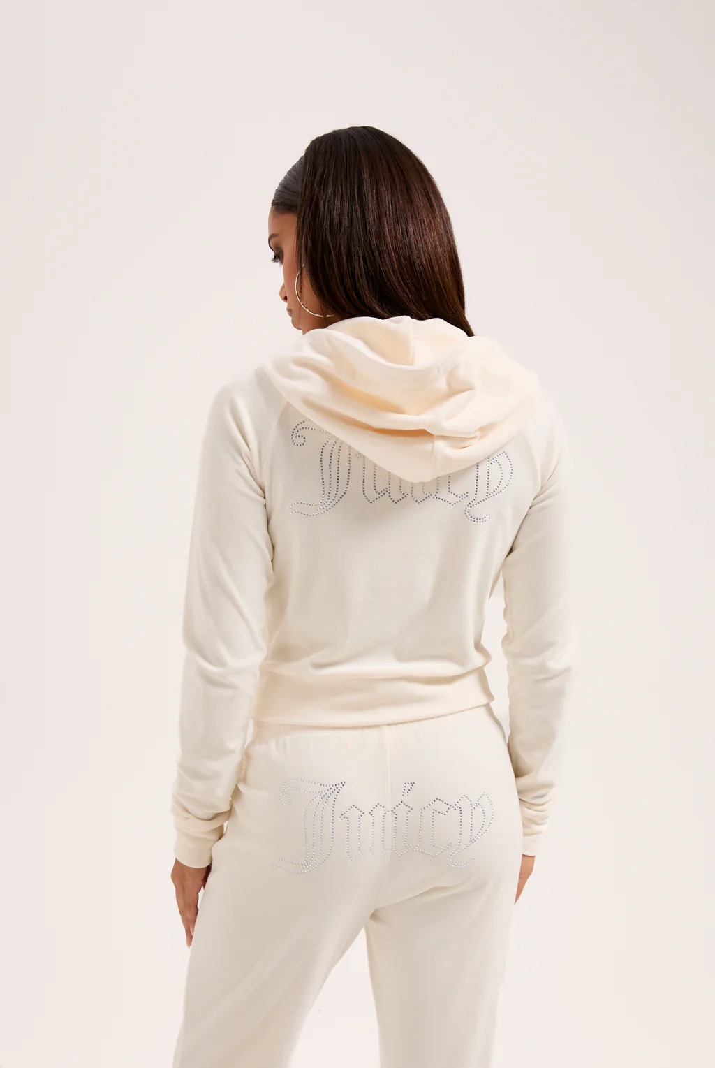 Diamanté embellished hoodie in sugar swizzle classic velour. Slim fit zip-through style with a hood, front pockets, and a statement crystal outline diamanté logo branding on the back. This hoodie is finished with a silver gothic J zip pull. Pair with the matching bottoms for a full iconic Juicy Couture tracksuit.