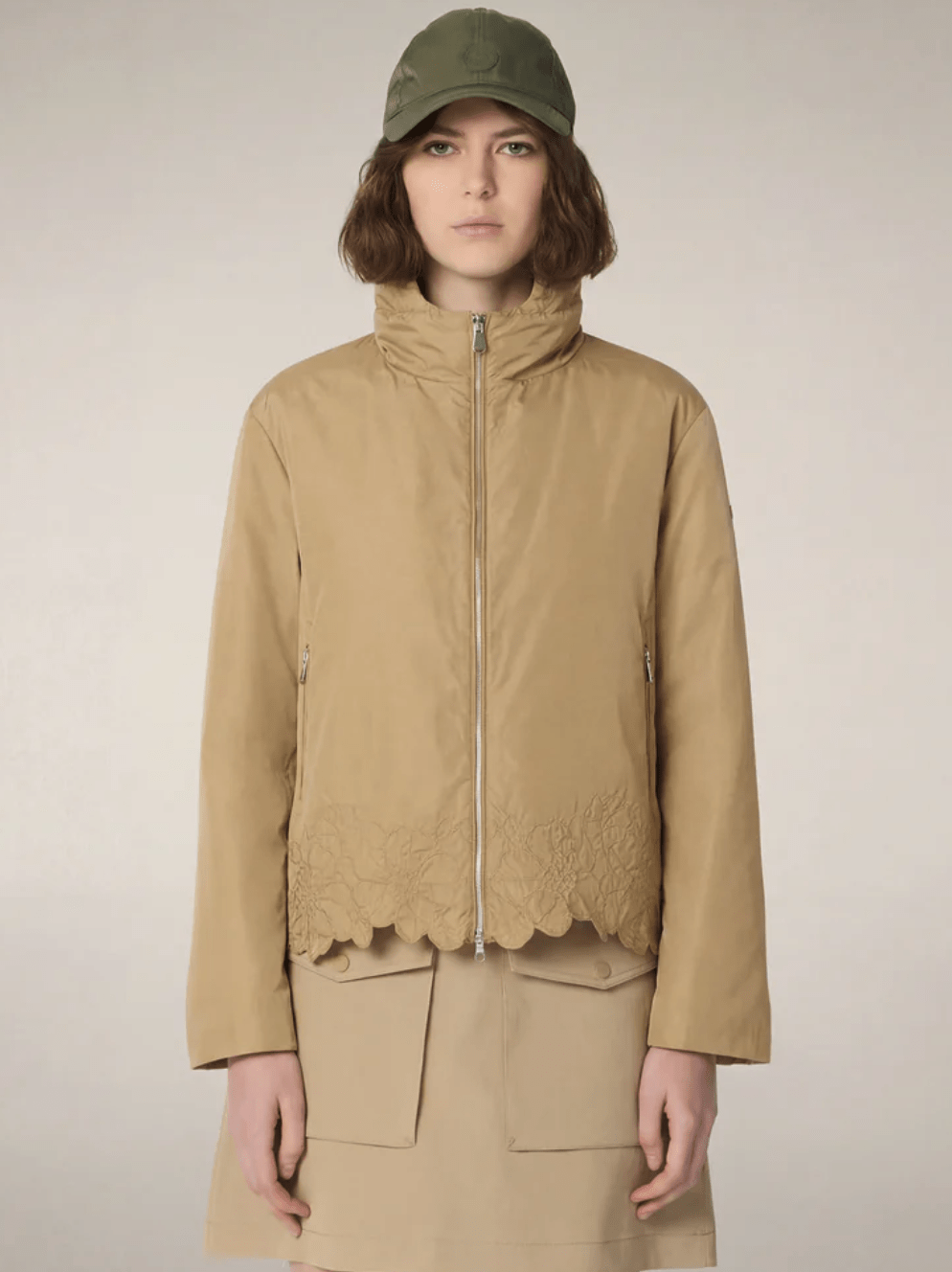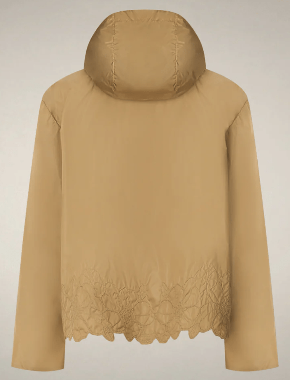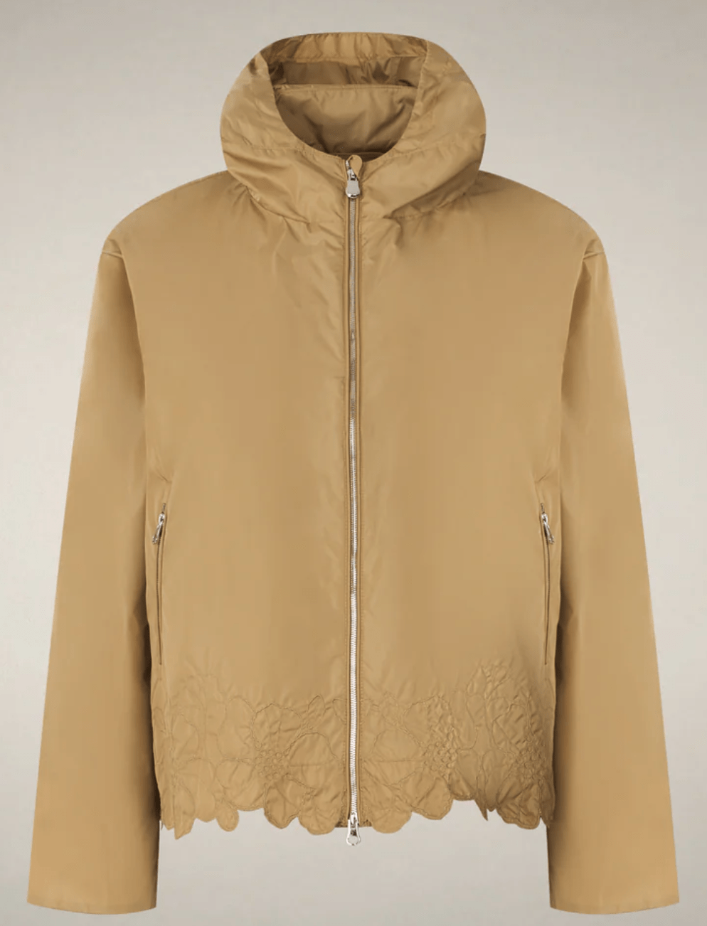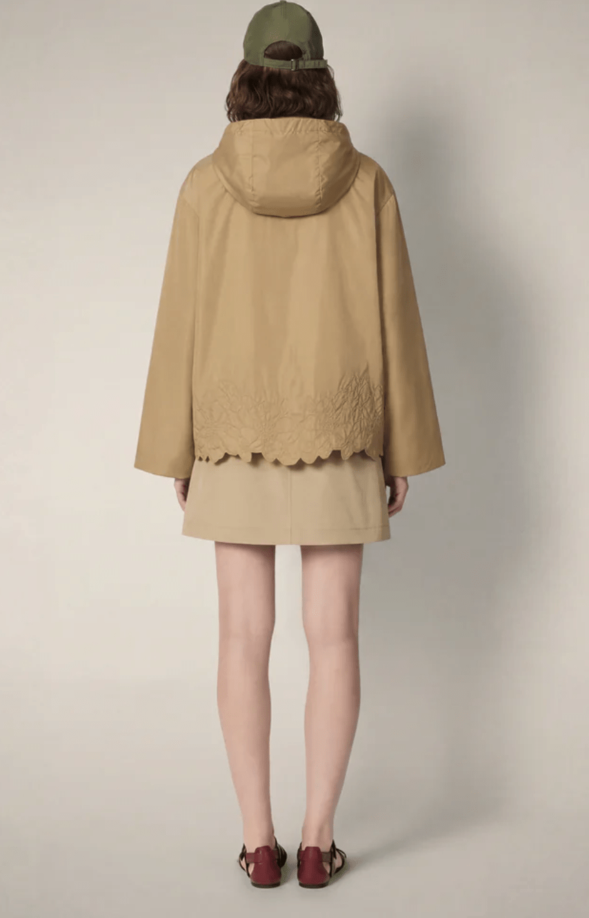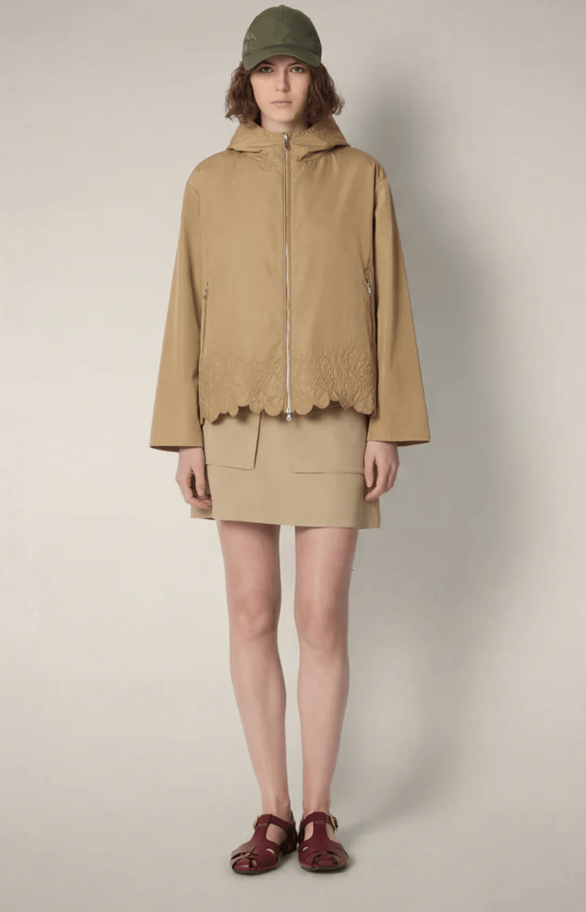 Feminine by design, the Flo model women’s hooded jacket updates the windbreaker in compact nylon with floral embroidery at the hem.