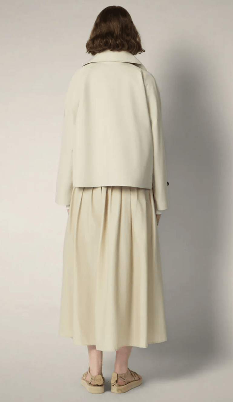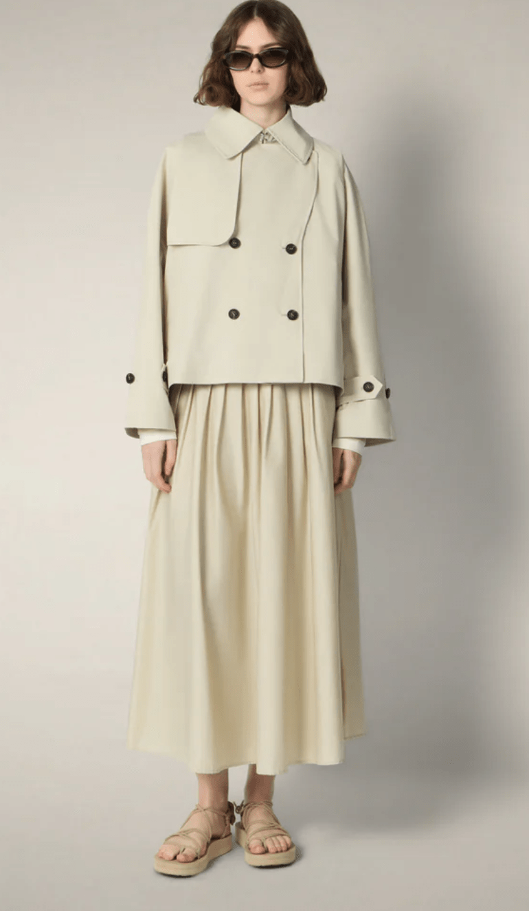 The Garbo model women’s jacket is a short trench in water-resistant fabric designed for light spring–summer layering.