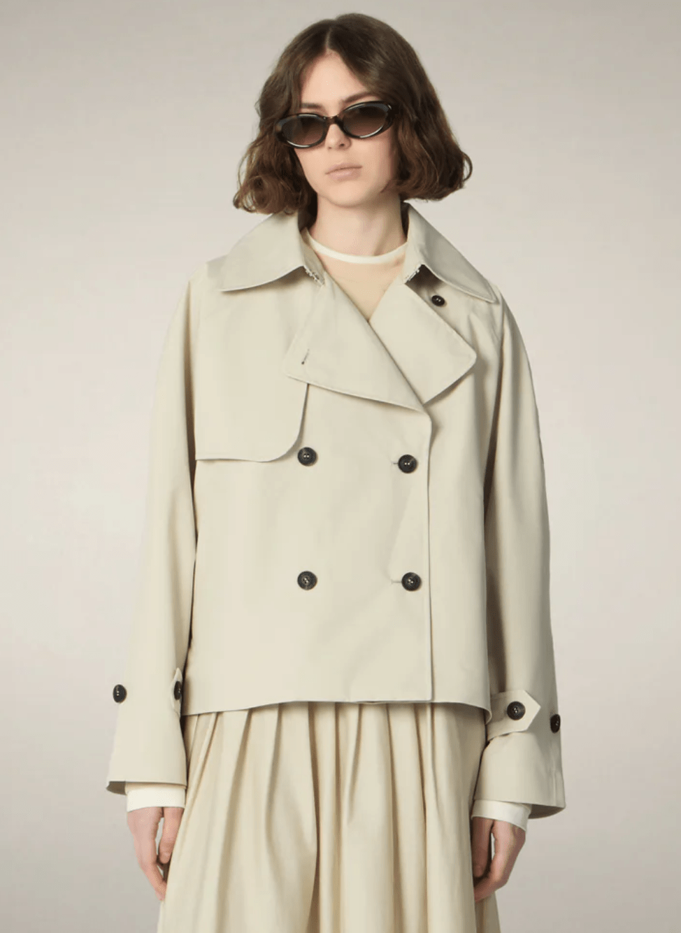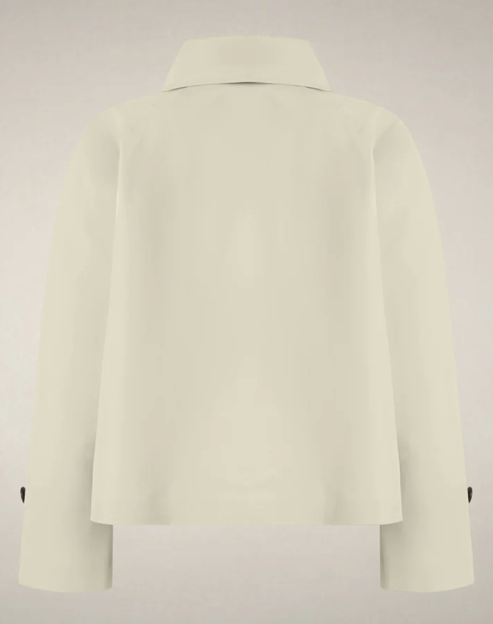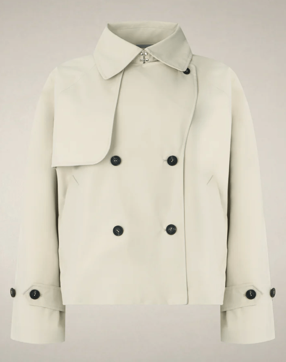 The Garbo model women’s jacket is a short trench in water-resistant fabric designed for light spring–summer layering. A double-breasted front with faux horn buttons conceals a hidden zipper, while welt pockets, raglan sleeves with taped seams, and buttoned cuff tabs refine the cut. A right-shoulder storm flap adds movement and a classic utility note.