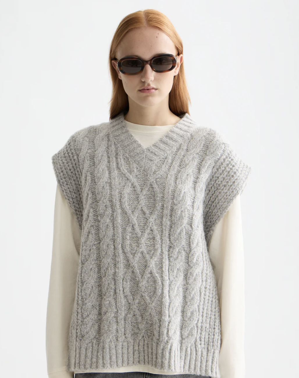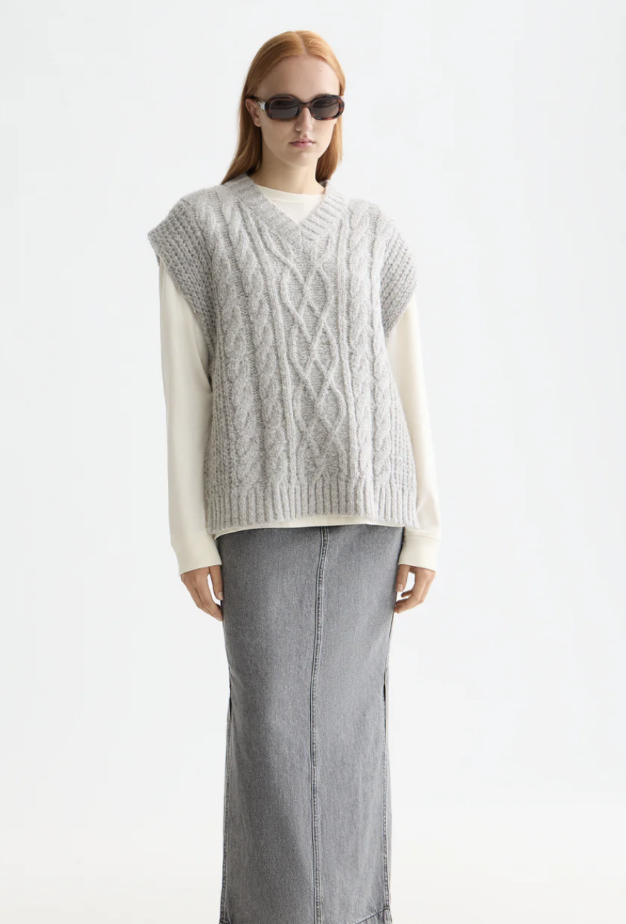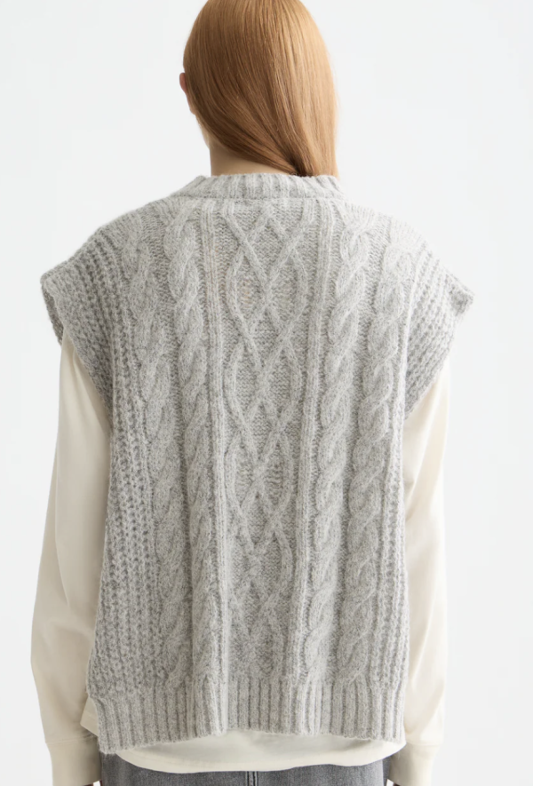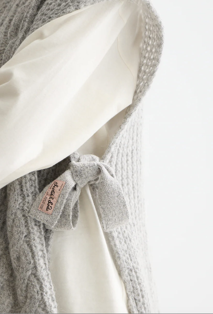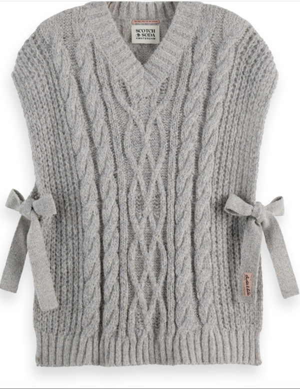 Our cable-knit spencer adds texture and versatility to layered looks, featuring bow ties on the side with a modern shape.